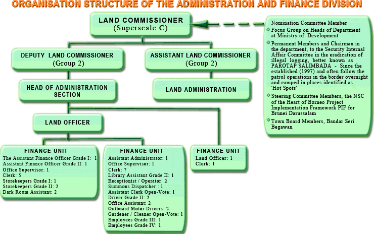 Duties and Responsibilities | No | Main Functions | | 1 | Administer and manage the staffs’ records service pertaining to annual leave, exit country leave, acting staff, promotion and others. | | 2 | Preparing and managing the Department’s annual budget expenditure. Payment of salaries, allowances, bonuses and relevant claims / payments [such as land acquisition compensation payments]. | | 3 | Coordinating with Districts Land Offices for collection of revenues and its arrears. | Senior Land Officer :Pengiran Dr Harizan bin Pengiran Haji Piut Tel. No : 2381181 Ext. 4412 |