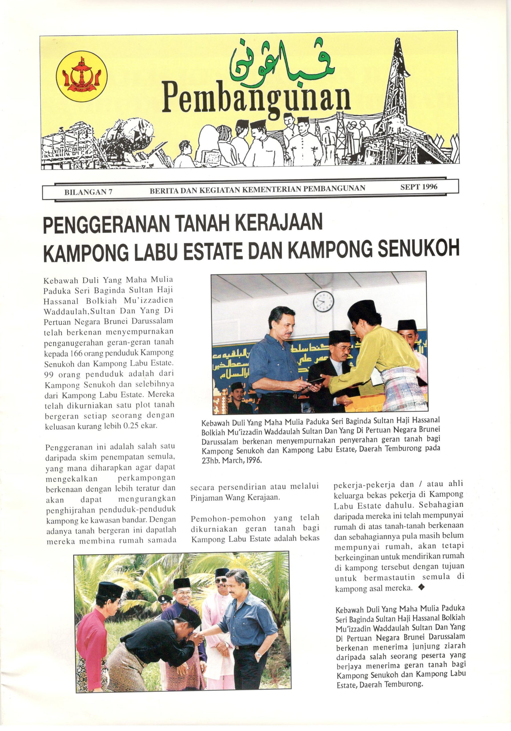 Keratan akhbar ini merakamkan peristiwa bersejarah pengurniaan geran-geran tanah kerajaan kepada penduduk Kampong Labu Estate dan Kampong Senukoh, Daerah Temburong, yang telah disempurnakan oleh Kebawah Duli Yang Maha Mulia Paduka Seri Baginda Sultan Haji Hassanal Bolkiah Mu’izzaddin Waddaulah. Inisiatif ini merupakan sebahagian daripada usaha Kerajaan dalam memastikan kesejahteraan rakyat melalui penyediaan hak milik tanah yang teratur serta menyokong penempatan semula dan pembangunan sosioekonomi masyarakat setempat.